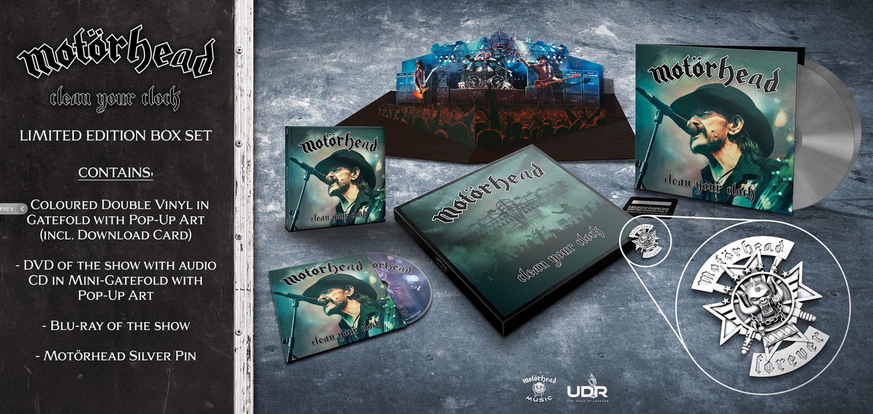 Les 20 et 21 novembre 2015 auront vu les dernières prestations de Lemmy Kilmister and Co à Munich en Allemagne. Histoire d’immortaliser ces 2 derniers shows de MOTORHEAD, le label UDR Music sort le 10 Juin 2016 un DVD intitulé « Clean Your Clock ». Bien que l’on y voit un Lemmy très fatigué, que l’on y entend une voix bien en peine, la hargne est toujours là, c’est joué à 100 à l’heure et pour ne rien gâcher de la fête, le célèbre « Bombardier » est de sorti.