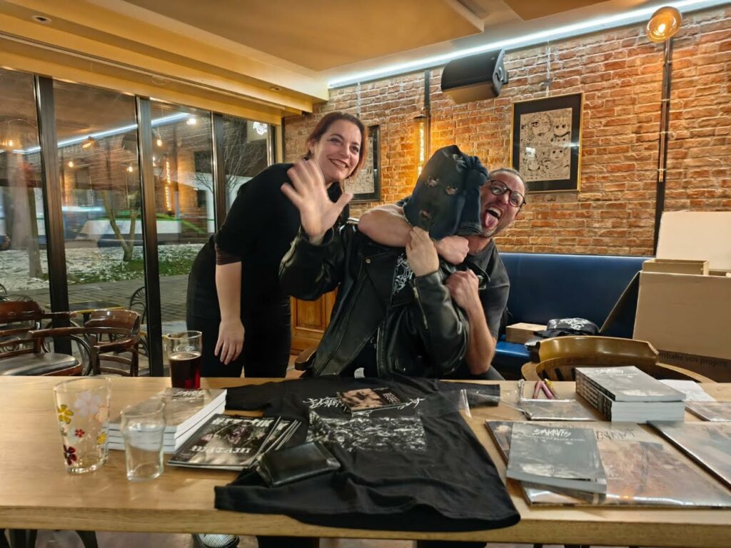 Après avoir patienté en buvant une (bonne) bière, on se décide à se rapprocher de la table où est déjà installé le plus Japonais des chroniqueurs de black metal (ou l’inverse, on ne sait pas trop!), accompagné d’Emilien, des Editions des Flammes Noires. En effet, c’est une tournée « promo » à l’occasion de la sortie de son livre « Sakrifiss, une vision du black metal« . Fort disert sous son masque, il nous met immédiatement à l’aise et nous ne tardons pas à deviser allègrement ! Sakrifiss évoque le parcours qui l’a mené de la sociologie à l’étude du japonais et à son installation au Japon depuis maintenant un quart de siècle.
