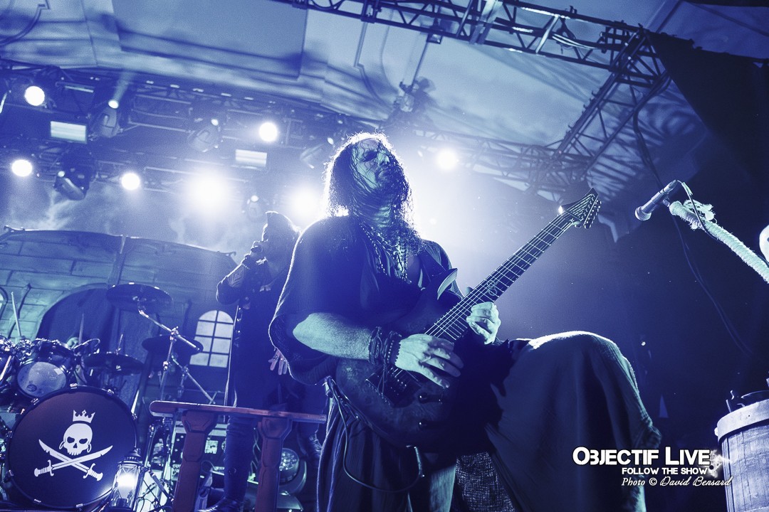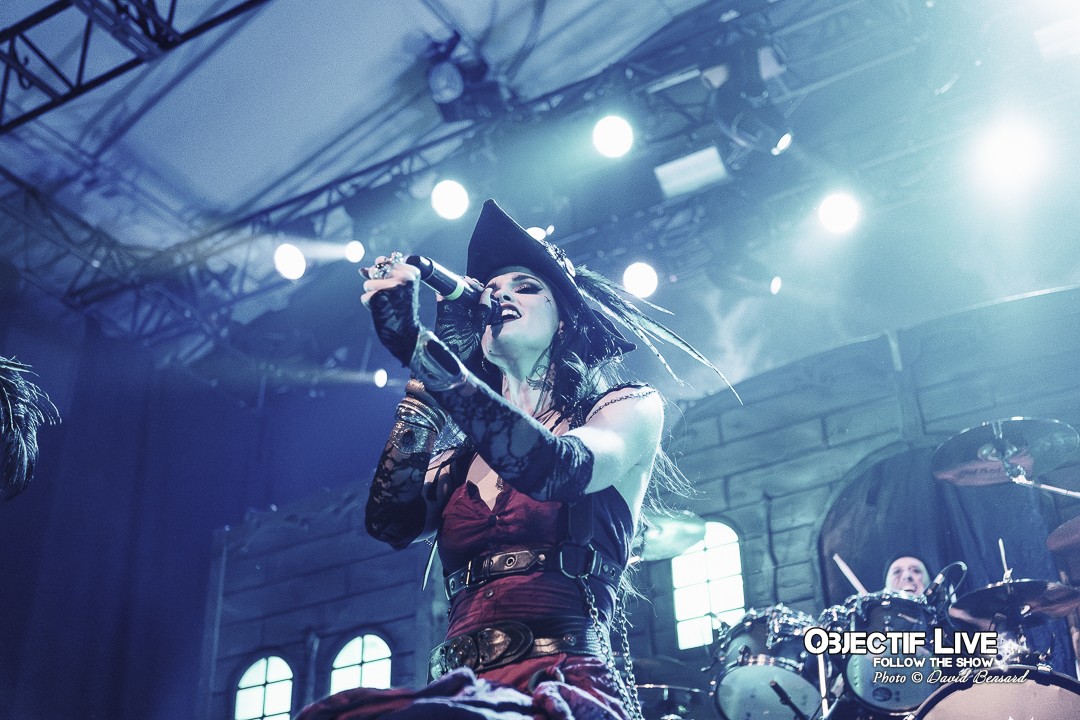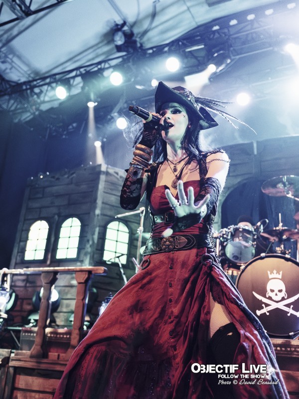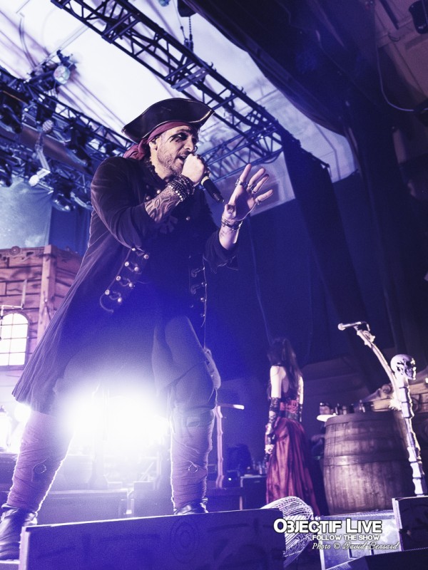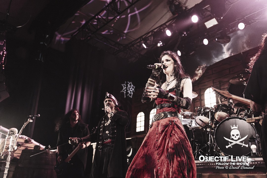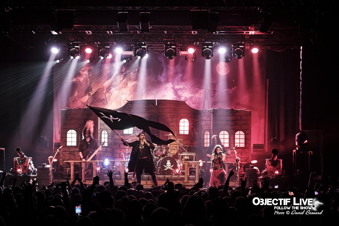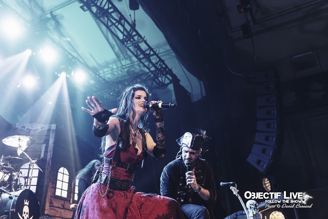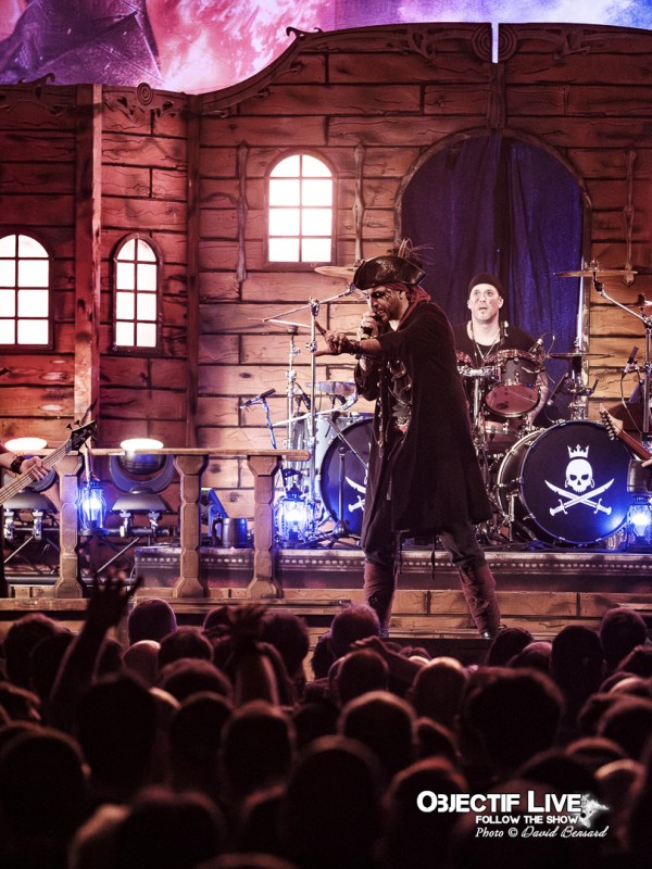 Dès l’ouverture du set, l’identité visuelle est clairement posée : décors maritimes, éclairages bleutés et mise en scène soignée plongent le public dans l’univers pirate désormais emblématique du groupe. Musicalement, la formation se montre immédiatement en place. La section rythmique offre une base solide, tandis que les orchestrations préenregistrées viennent renforcer la dimension épique sans jamais étouffer les guitares. En ce début de Set sous l’interpellation « ça manque de Kings ici » les WARKINGS sont invités sur scène pour interpréter ensemble le Pirates & Kings.