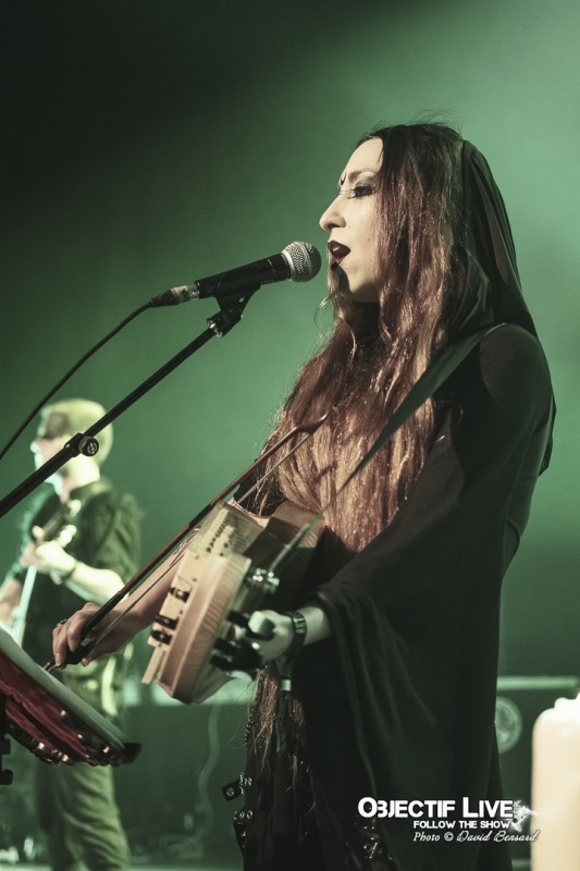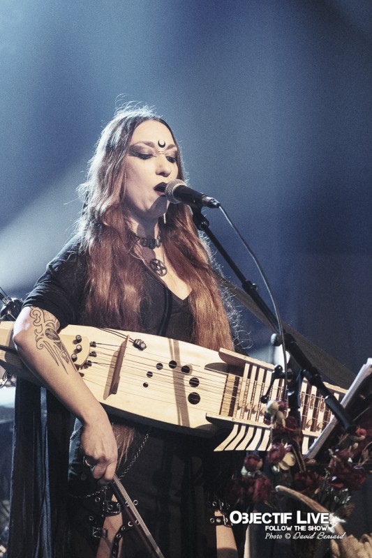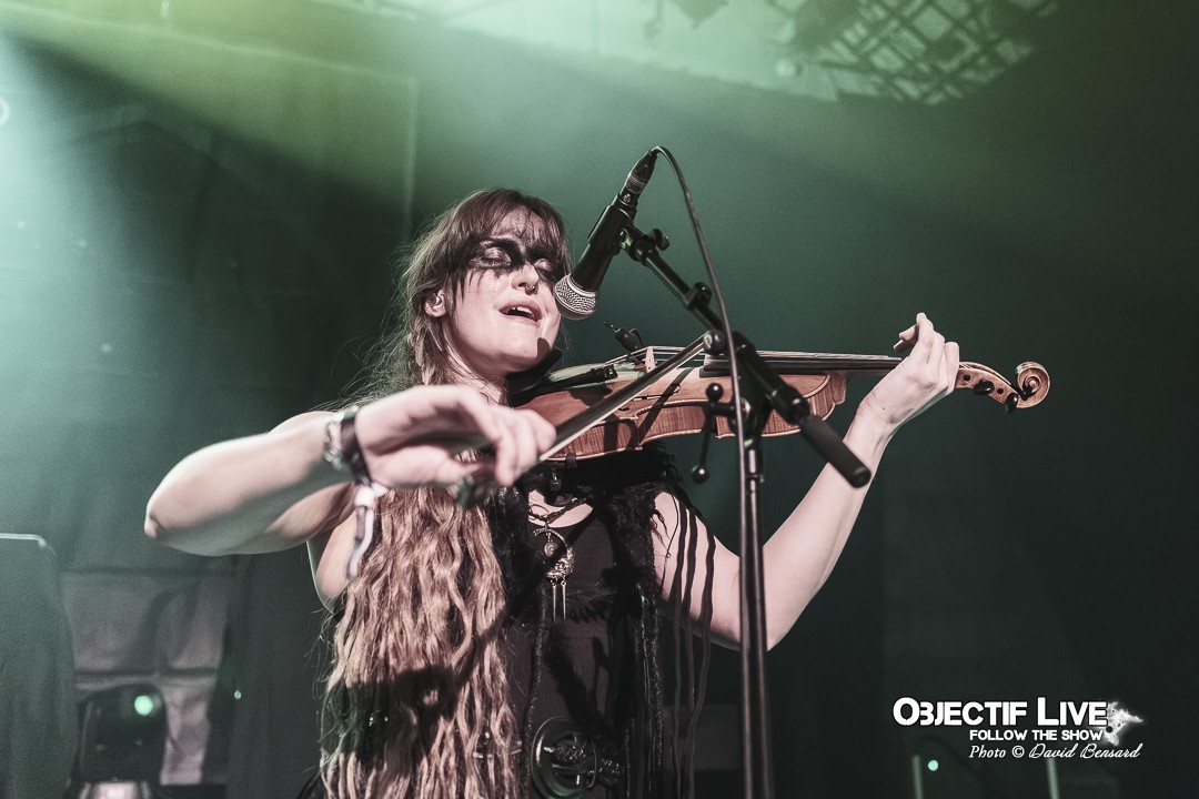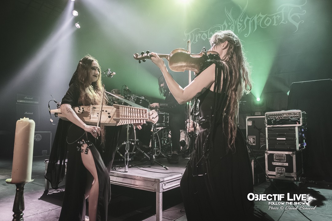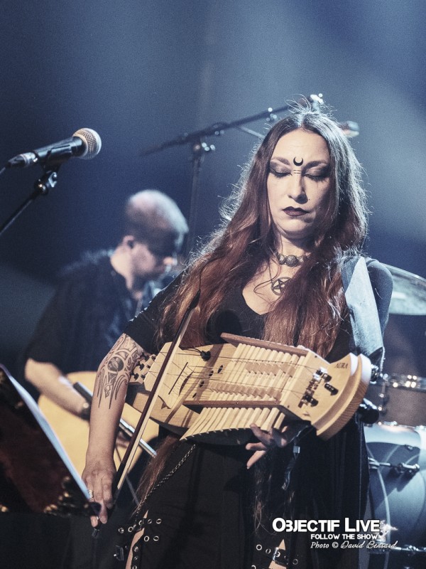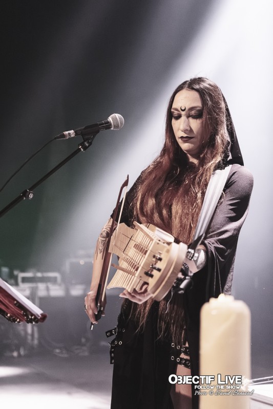 Porté par la présence magnétique de Lady Morte, Trobar de Morte déroule un set parfaitement maîtrisé. Très vite, le groupe impose son identité sonore : une fusion élégante entre percussions tribales, cordes acoustiques, nappes électroniques discrètes et arrangements néo-classiques finement ciselés. La voix, claire et habitée, survole cet ensemble avec assurance, guidant le public à travers les différentes étapes du concert.