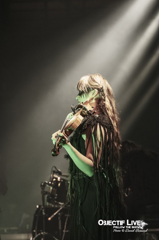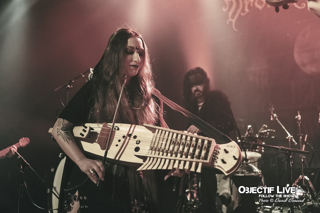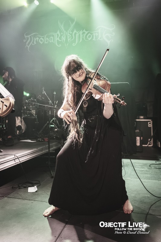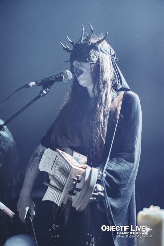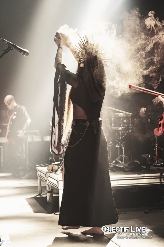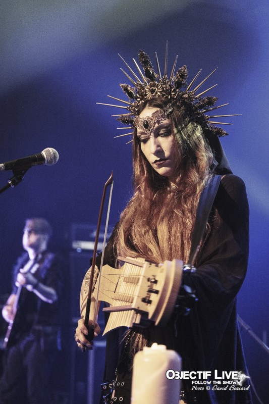 Porté par la présence magnétique de Lady Morte, Trobar de Morte déroule un set parfaitement maîtrisé. Très vite, le groupe impose son identité sonore : une fusion élégante entre percussions tribales, cordes acoustiques, nappes électroniques discrètes et arrangements néo-classiques finement ciselés. La voix, claire et habitée, survole cet ensemble avec assurance, guidant le public à travers les différentes étapes du concert.