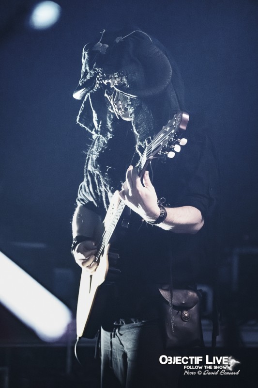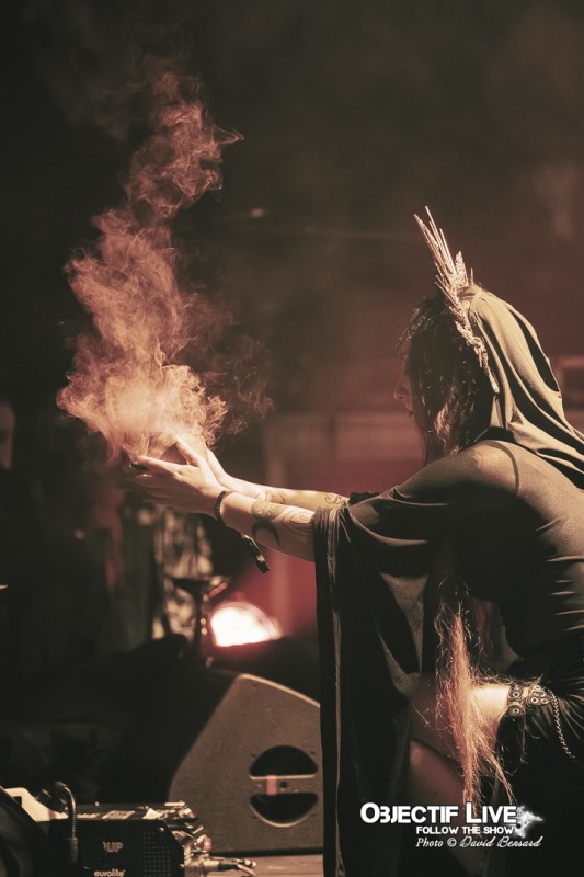 Dès que les lumières s’éteignent, l’ambiance change radicalement. La salle est rapidement plongée dans une pénombre soigneusement travaillée, ponctuée de teintes chaudes et de halos tamisés. Une odeur d’encens flotte dans l’air, installant immédiatement un climat singulier. Il ne s’agit pas ici d’un simple concert : Trobar de Morte annonce clairement une expérience.